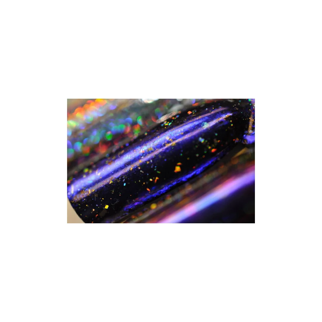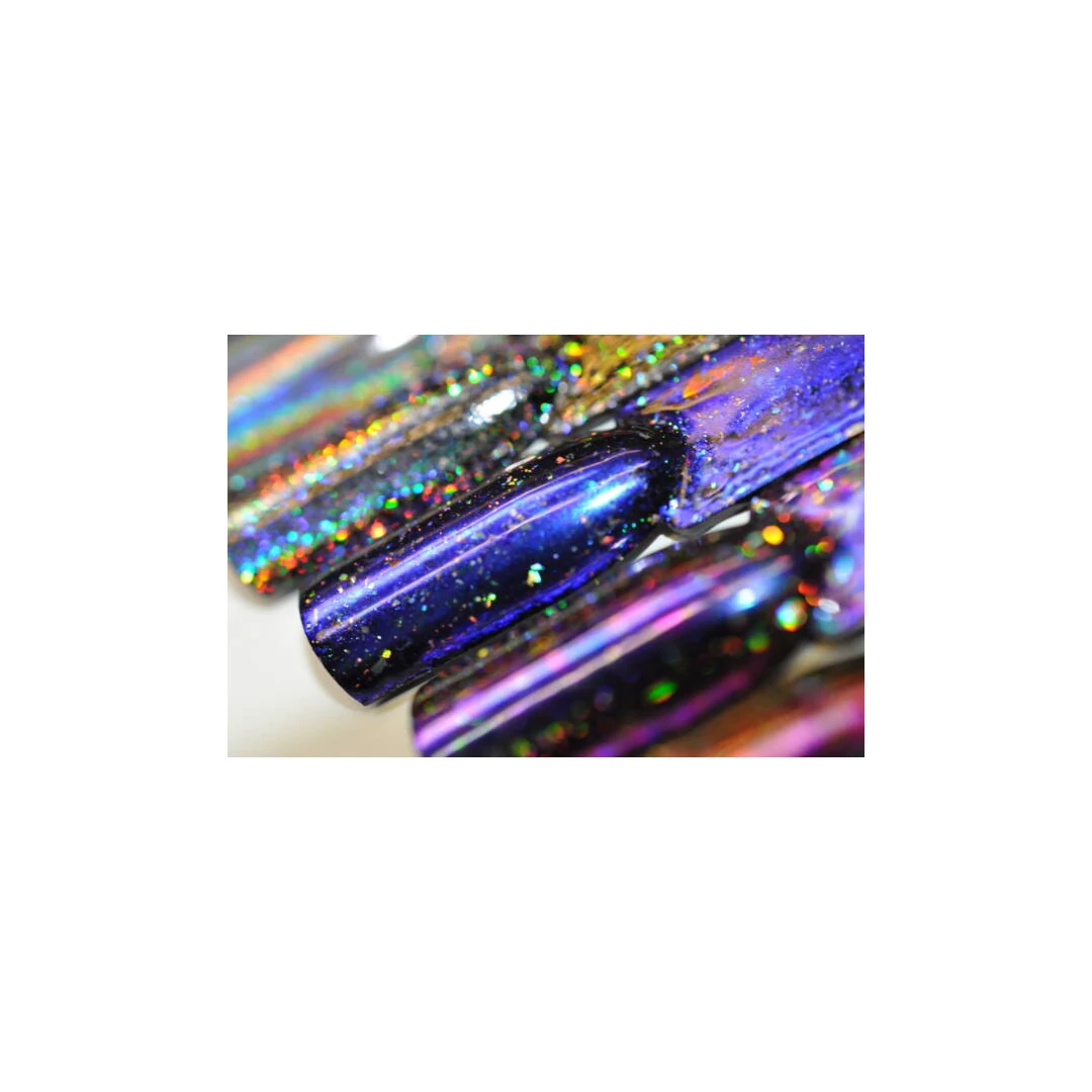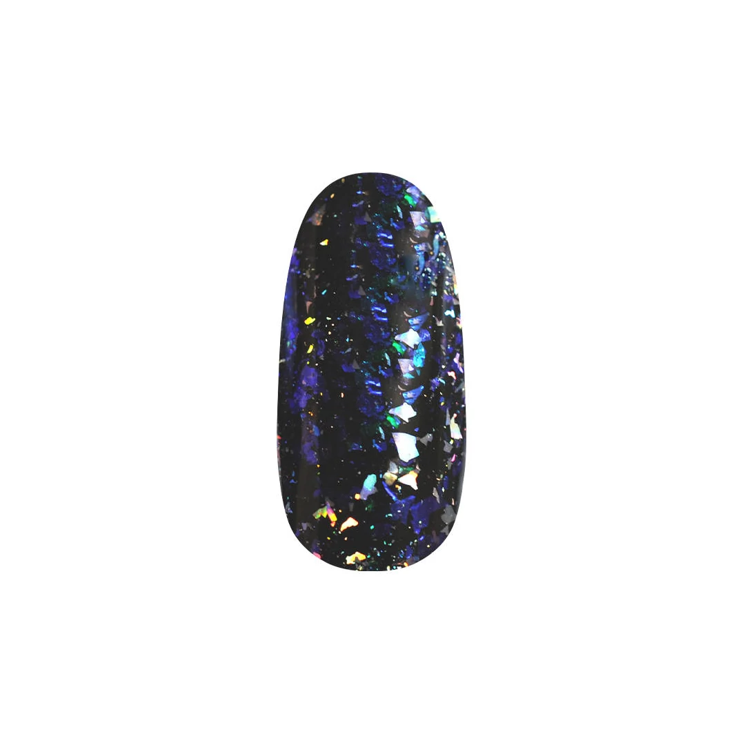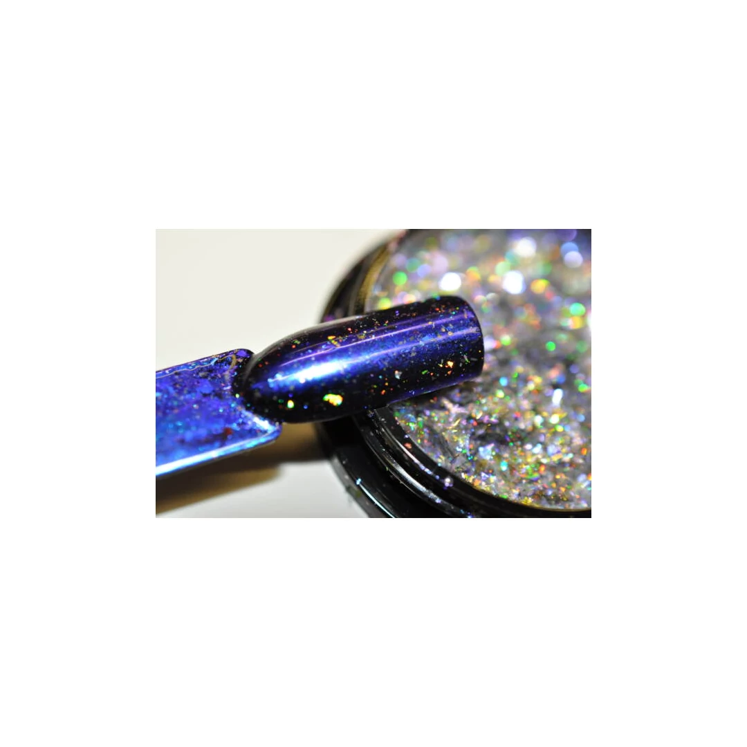 Aplică pigmentul pe o suprafață fără strat de dispersie. Utilizează o culoare de bază mai închisă (de exemplu, negru) pentru un efect mai puternic. Baza poate fi Gel Lac One Step Color, Premium Finish Color Gel sau orice fel de culoare acoperit cu gel de luciu fără strat de dispersie (de exemplu Chrome 2 Top Gel). În cazul unui gel de luciu, polimerizează-l timp de 15-30 de secunde, apoi lustruiește sau presează fulgii sau pulberea pe suprafața unghiei (cu degetul, cu un stilou decorativ cu capăt de silicon sau cel mai bine cu un burete – efectul obținut este diferit în funcție de modalitate de aplicare). Îndepărtează excesul cu o perie moale, densă și acoperă suprafața cu gel de luciu flexibil în 2 straturi (de ex. Chrome 2 Top Gel / EO Top Gel), având grijă să sigilezi și marginile.